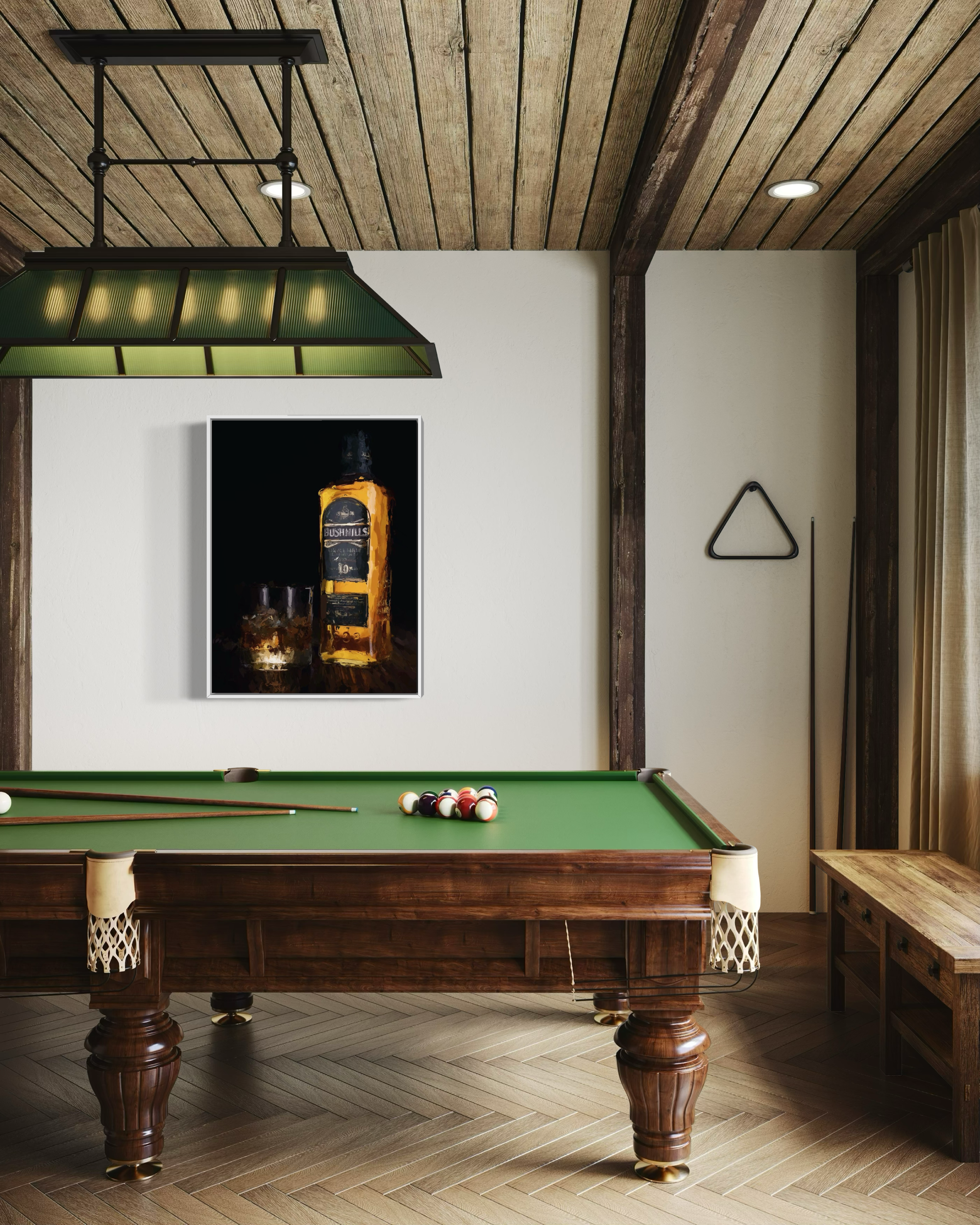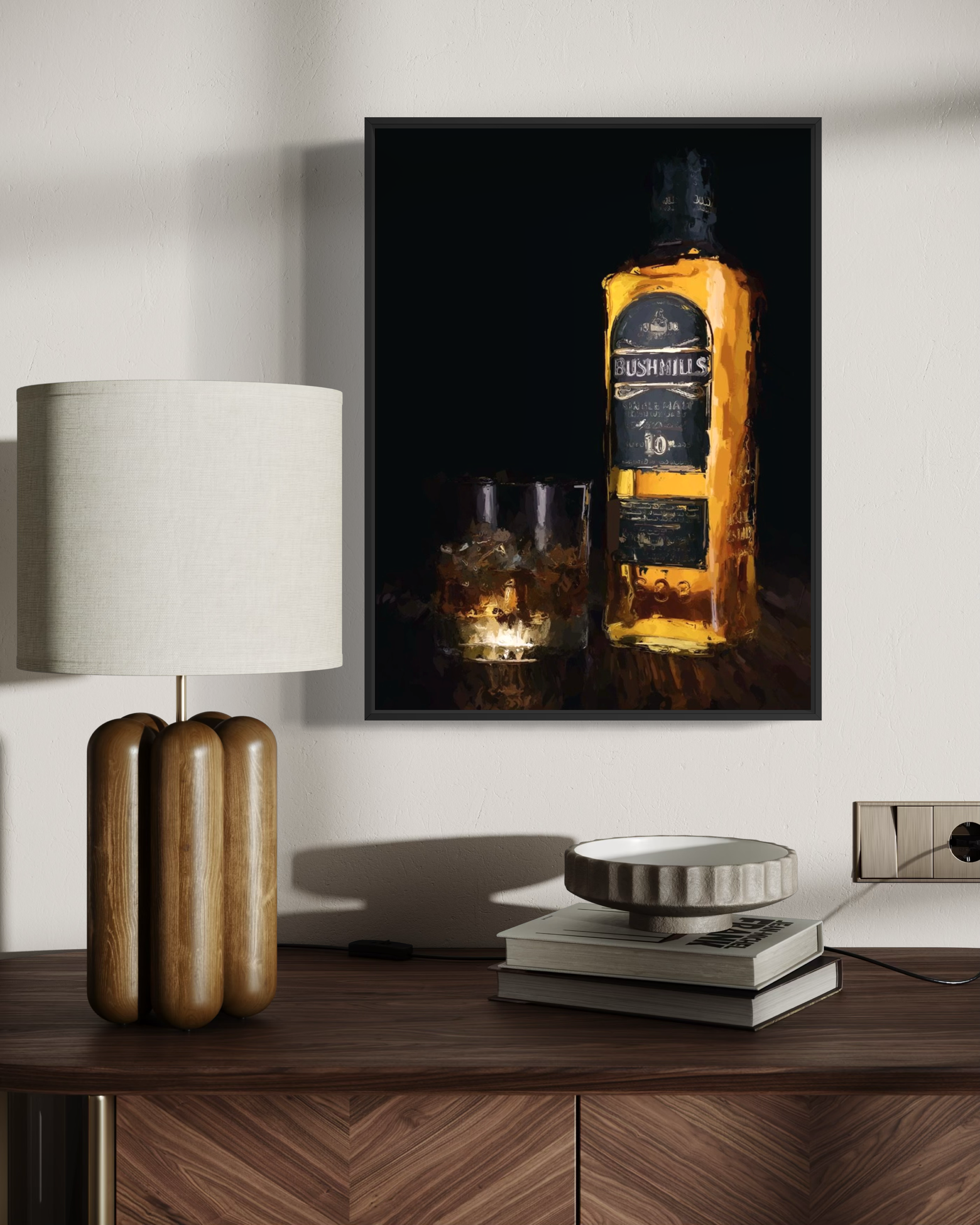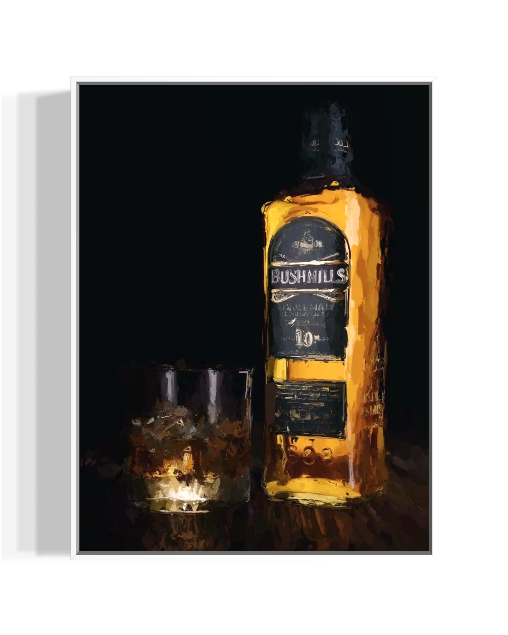 A canvas print of my original artwork, featuring a still life of the iconic Bushmills whiskey bottle in its distinctive gold tones, accompanied by a glass of the tipple served over ice. Set against a dark background, the piece captures the timeless appeal of a well-poured whiskey, celebrating both the bottle and the moment without unnecessary detail.