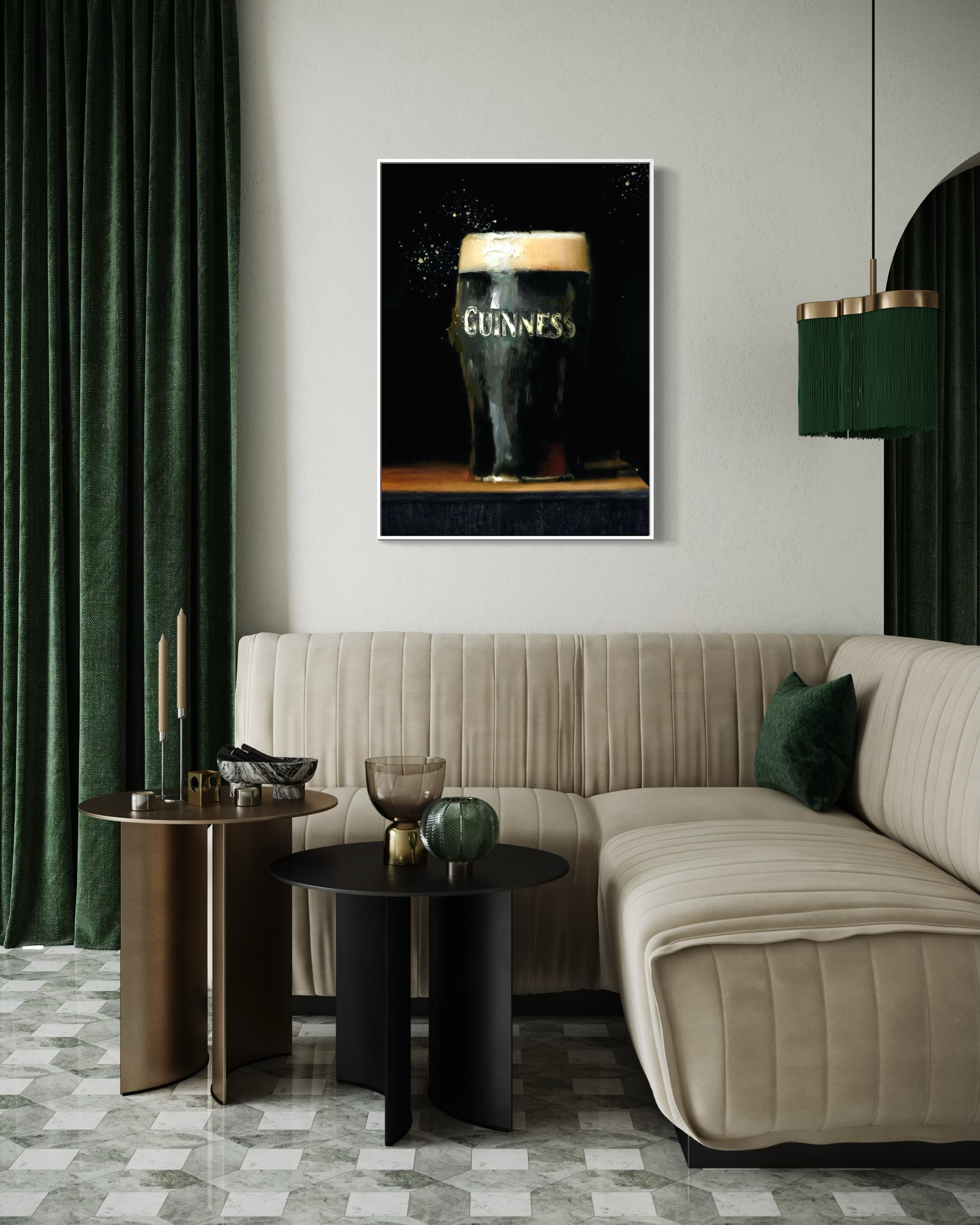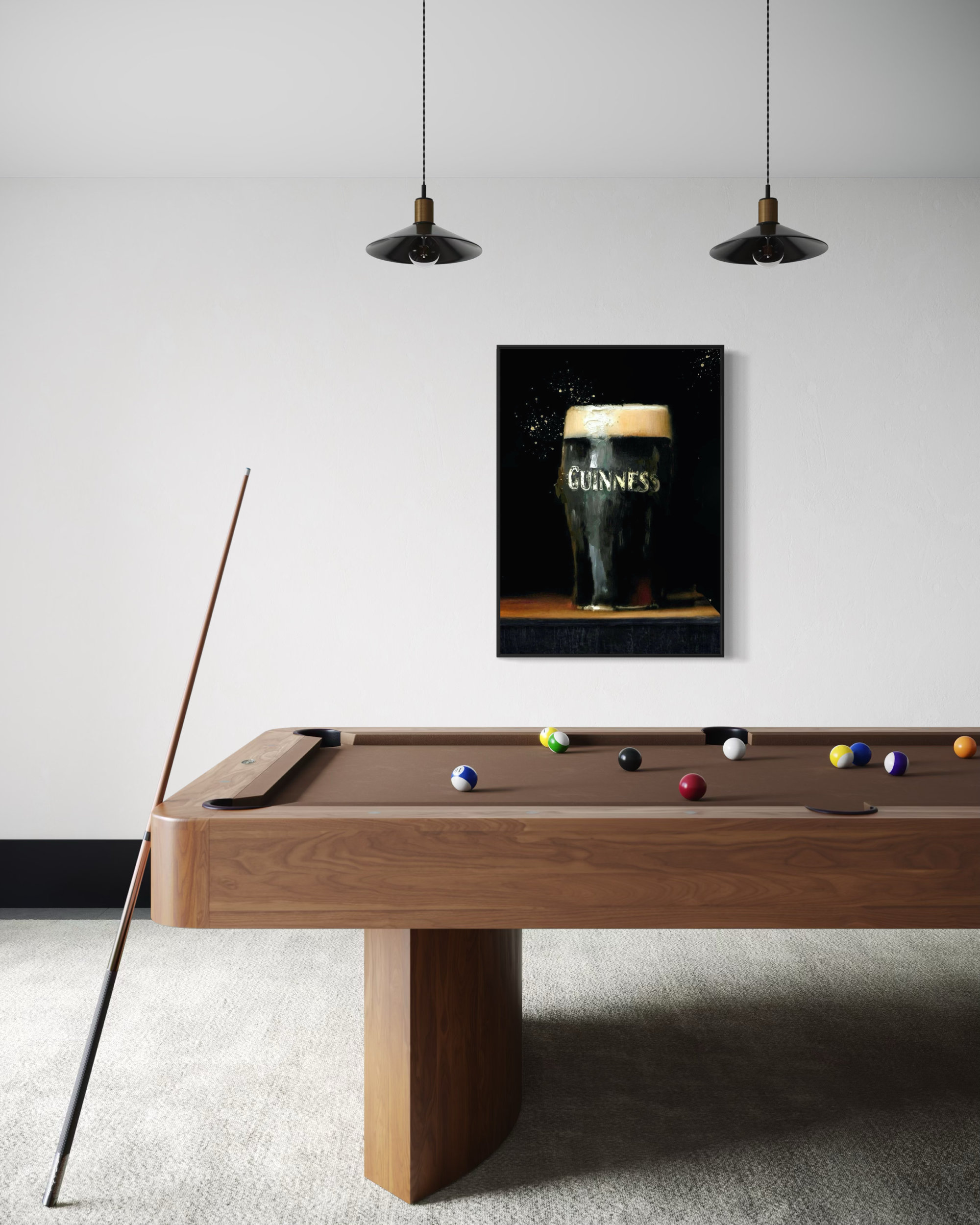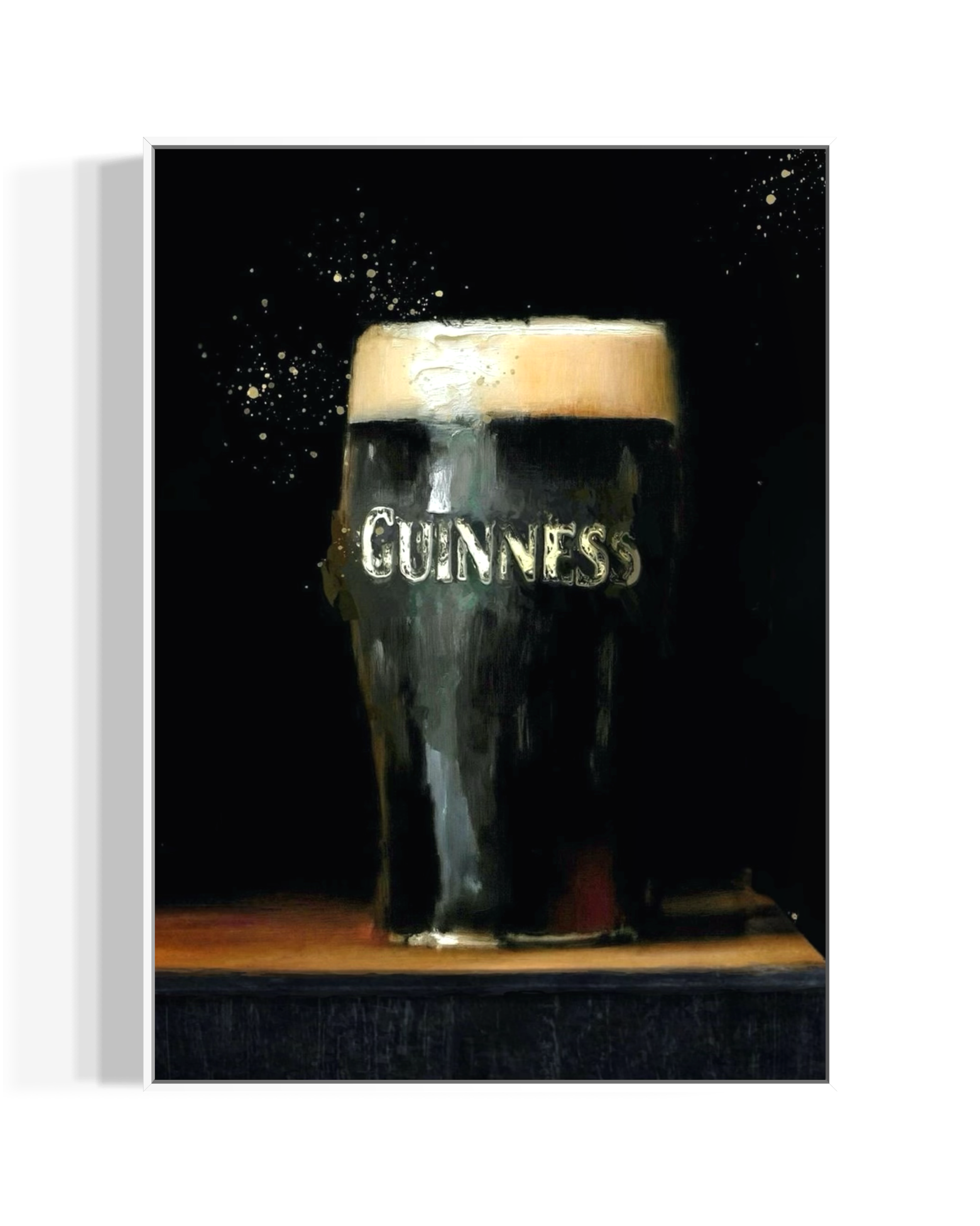A canvas print of my original artwork, featuring a single creamy pint of Guinness resting on a wooden bar top, set against a dark, atmospheric background. The contrast between the soft, pale head and the deeper surrounding tones gives the piece a quiet strength and focus. Simple and familiar, the composition celebrates an everyday icon without fuss or excess detail.