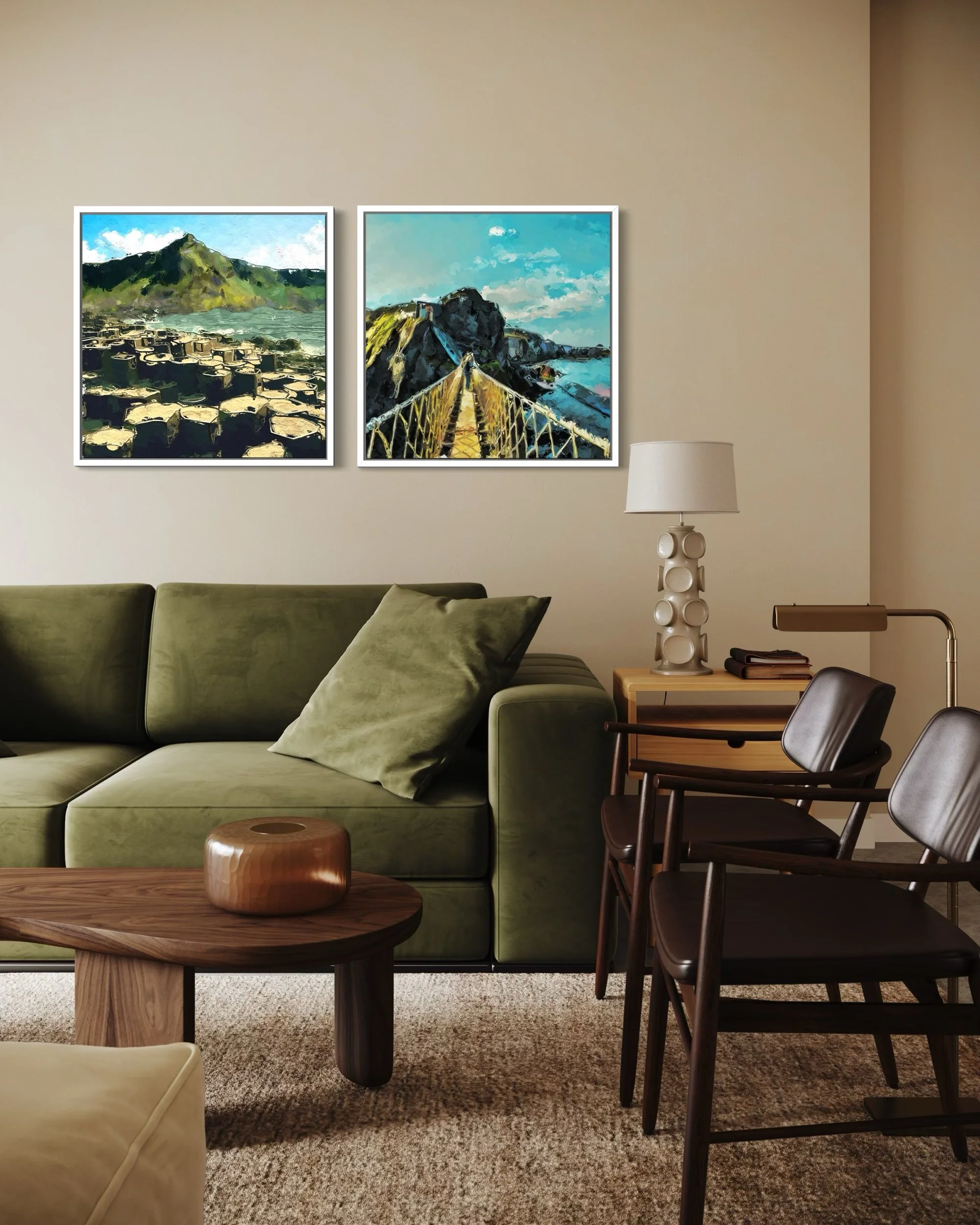 A hand-embellished canvas print of my original artwork, featuring the iconic Carrick-a-Rede Rope Bridge. Designed as a complementary piece to my Giant’s Causeway and Mussenden Temple prints, this artwork captures the bridge set within the vibrant blues and greens of the County Antrim coastline on a bright, clear day.